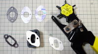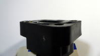 キャブレターをエンジンに固定し、同時にエンジンの圧力をキャブレターに通す部品です。 硬い樹脂で出来ていますがエンジンの熱が繰り返し加わり徐々に劣化・変形します。 新品時でも締め付けを考慮してかやや湾曲している場合もありますが、劣化が進行するとエンジンとの隙間
